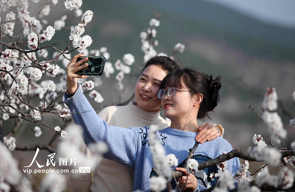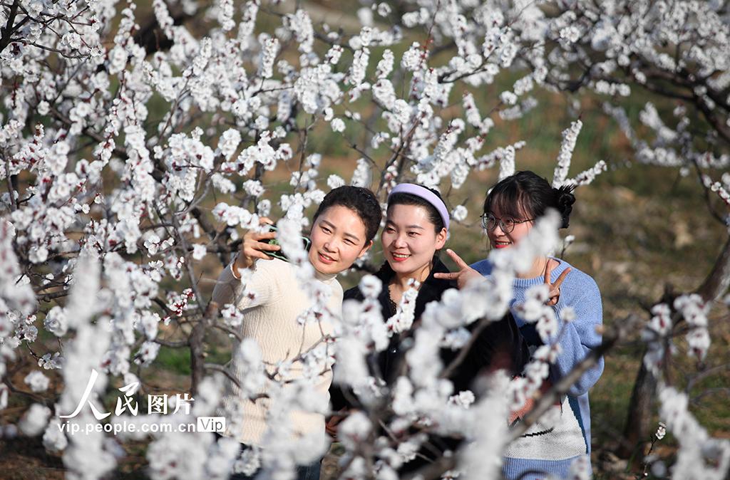 2026年3月13日,安徽淮北市杜集区矿山集街道,杏花绽放枝头,吸引众多游客前来赏花拍照、游玩。刘棋摄(人民图片网)